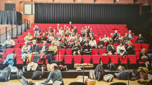 De gastdirigent was ook onze partiële lesgever, trompetten, hoorns en eufoniums. Voor de rieten was Sofie verantwoordelijk, het zwaar geschut en de trombones kregen Sofie haar man Dieter voor zich. De hobo’s en dwarsfluiten kregen les van de befaamde hoboïst Paul Dombrecht en de verrassing van de dag was voor velen onder ons de lesgever voor slagwerk, onze oud dirigent Peter Wouters. Tof om hem nu weer te begroeten in Dworp waar het 20 jaar geleden allemaal met hem begon.