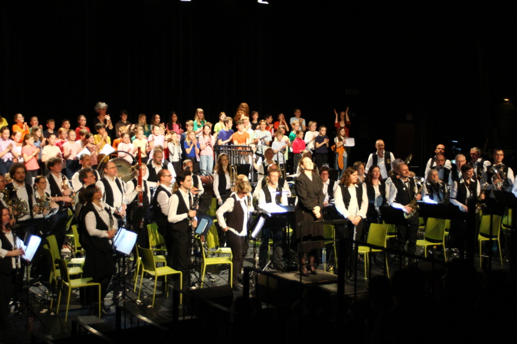 De harmonie op het podium van de Borre, niets nieuws zou u denken. En toch! In samenwerking met het kinderkoor van academie De Vonk, jeugdkoor Ko’Ma en 5 fantastische acteurs bracht de harmonie op zaterdag 30 maart een unieke voorstelling. Onder leiding van regisseur Roel Laethem speelden we “De reisgenoot”, een hoorspel van het geluidshuis. We deden dat niet één, niet twee, maar wel drie keer. |
